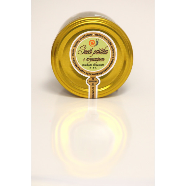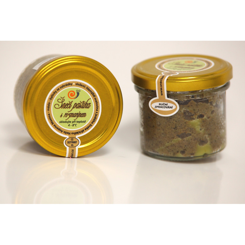 Vynikající šnečí paštika s rozmarýnem. Podáváme na rozpečený toust. Přizdobíme jarní cibulkou, plátkem červené papriky. Podáváme ke kvalitnímu vínu nebo sektu.